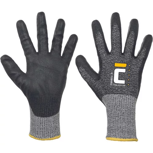 • tenyéren és ujjakon fekete PU mártott, varrat nélküli, kötött védőkesztyű • a legmagasabb, F szintű vágásvédelemmel