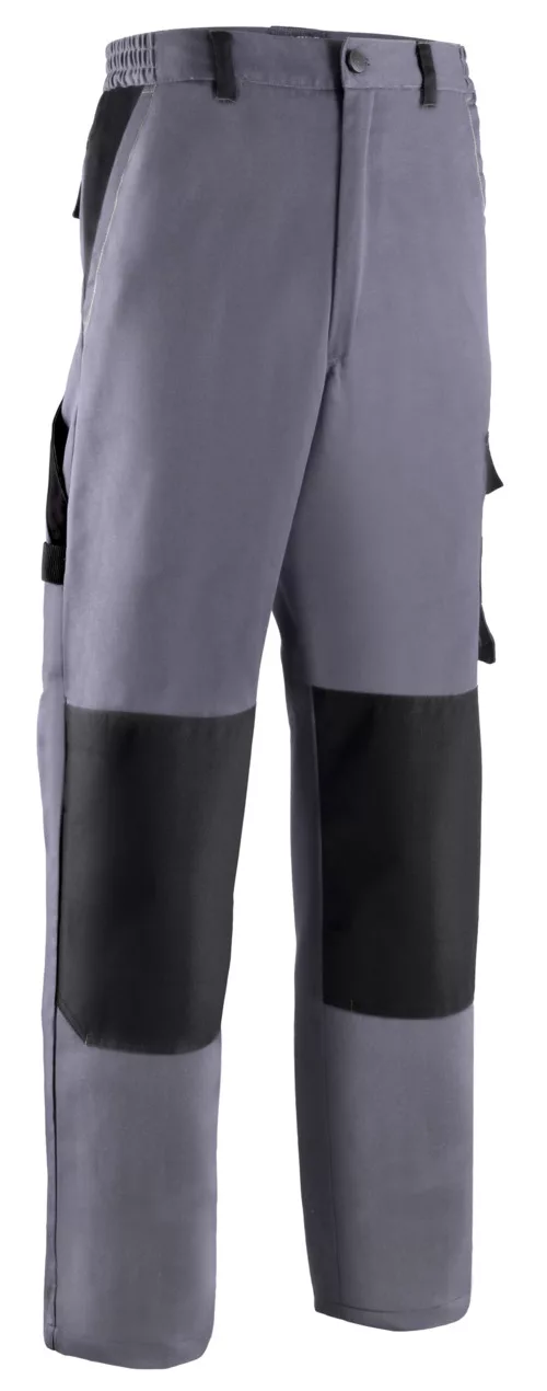 Twill (sávoly szövés): 60% pamut/40% PES - 270 g/m² + Oxford 600D - acélszürke, Gumírozott derék, 6 zseb, 2 szerszámtartó hurok, Oxford térdvédő zsebek, Kontraszt színek, Regular fit,EN 14404: type 2