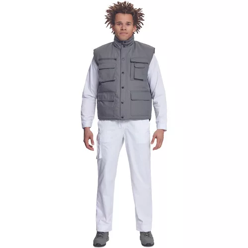 • bélelt mellény állógallérral • hosszított hátrész • műanyag patentokkal