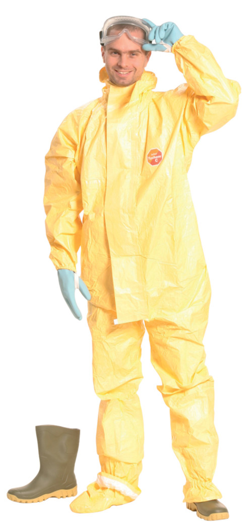 * Tychem 2000 C 83 g/m2 vastag polimer bevonatos Tyvek(R) alapanyagú, sárga, antisztatikus, kapucnis védőoverall lábfejvédővel* véd bármely szemcsenagyságú por és radioaktív részecskék ellen, 2 bar nyomásig ellenáll szervetlen fröccsenő vegyszereknek, általános fertőtlenítőszereknek és véd mikroorganizmusok és vér ellen* rendkívül nagy kopásállóságú és szakítószilárdságú, gumizott derék-, arc-, csukló- és bokarész, dupla cipzárfedél öntapadós ragasztószalaggal, biztonsági szalagok, rugalmas hüvelykujjakasztó* a lábfejvédő a lábbelin belül viselhető, térdig dupla csizmahajtókás, integrált zoknival