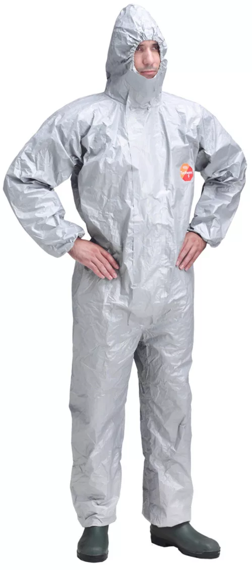 * Tychem 6000 F 118 g/m2 vastag poliészter filmréteggel bevont Tyvek(R) alapanyagú, szürke, antisztatikus, kapucnis védőoverál* véd bármely szemcsenagyságú por és radioaktív részecskék ellen, 5 bar nyomásig ellenáll szervetlen és számos szerves fröccsenő vegyszereknek, olajoknak, oldószereknek és véd mikroorganizmusok és vér ellen* rendkívül nagy kopásállóságú és szakítószilárdságú, gumizott derék-, arc-, csukló- és bokarész, dupla cipzárfedél öntapadós ragasztószalaggal, biztonsági szalagok, rugalmas hüvelykujjakasztó * III. védelmi kategória, 3., 4., 5. és 6. típusú védelem