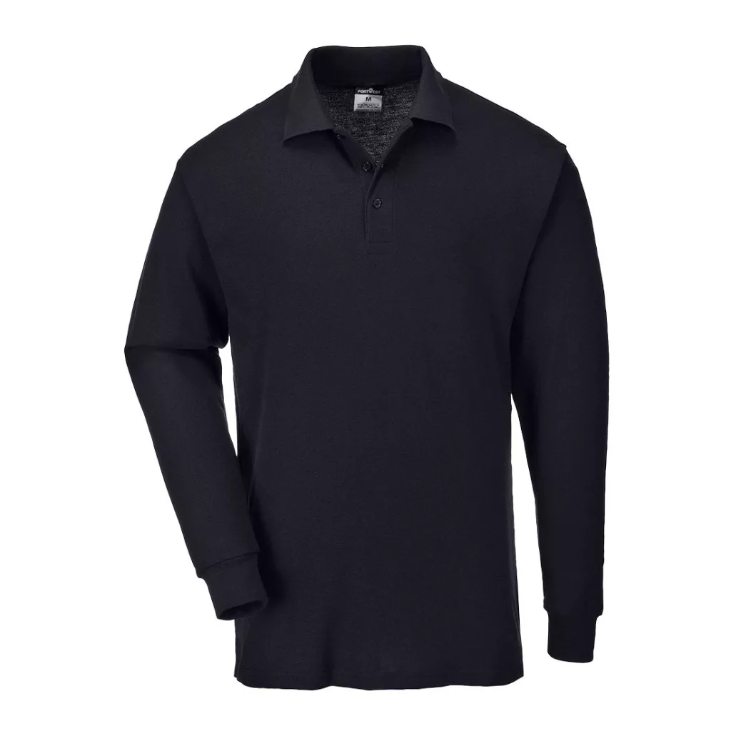 This stylish and practical long sleeved polo shirt offers full upper body comfort for casual wear. Classic features include a rib knitted collar and cuffs, a three button placket and matching buttons. A heavyweight polyester cotton mix ensures garment durability.