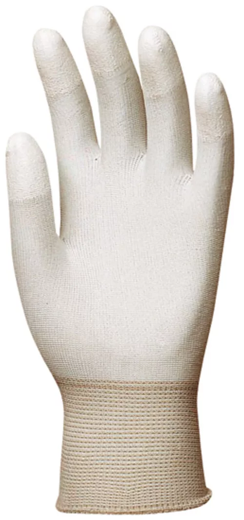 Fehér, varrás nélküli, poliészterrel erősített, 13-mas kötésű kesztyű. Fehér poliuretán ujjbegyben mártott.Kötött mandzsetta