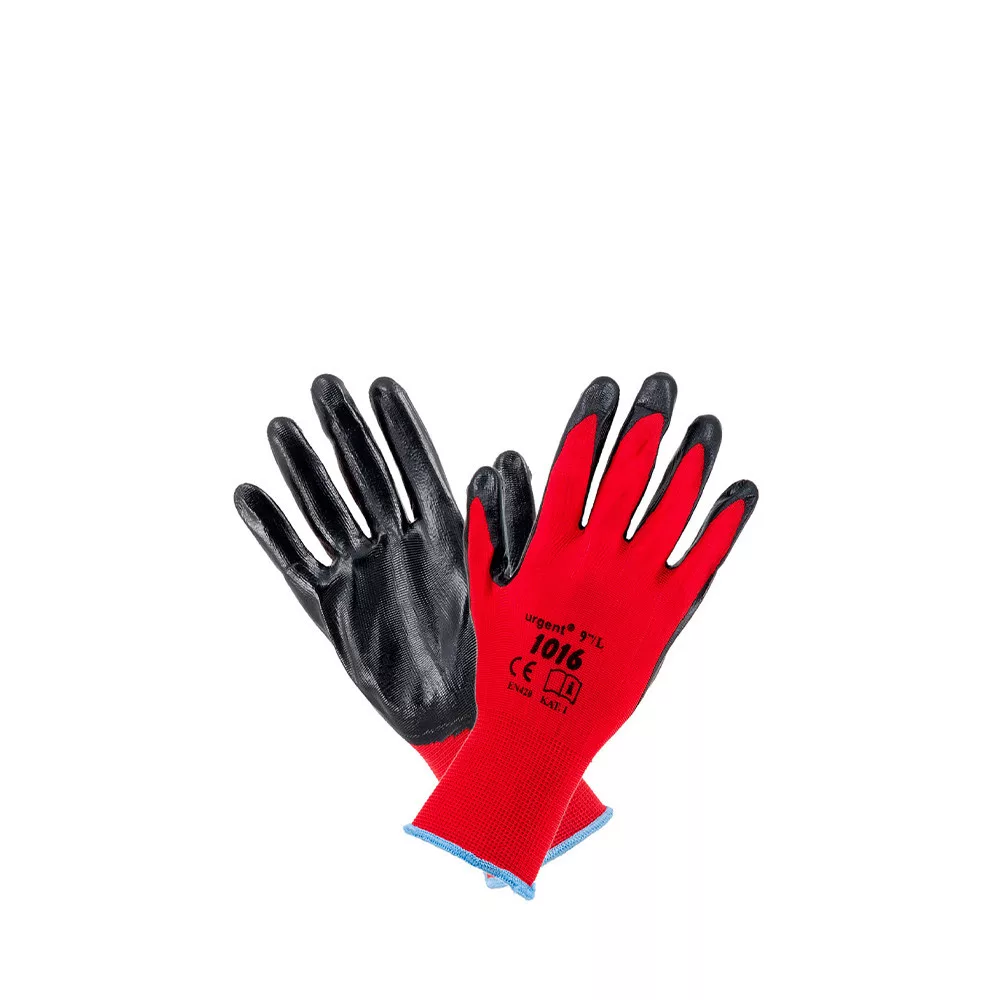 Tenyerén nitrilbe mártott olajálló poliészter védőkesztyű, gumírozott mandzsettával.