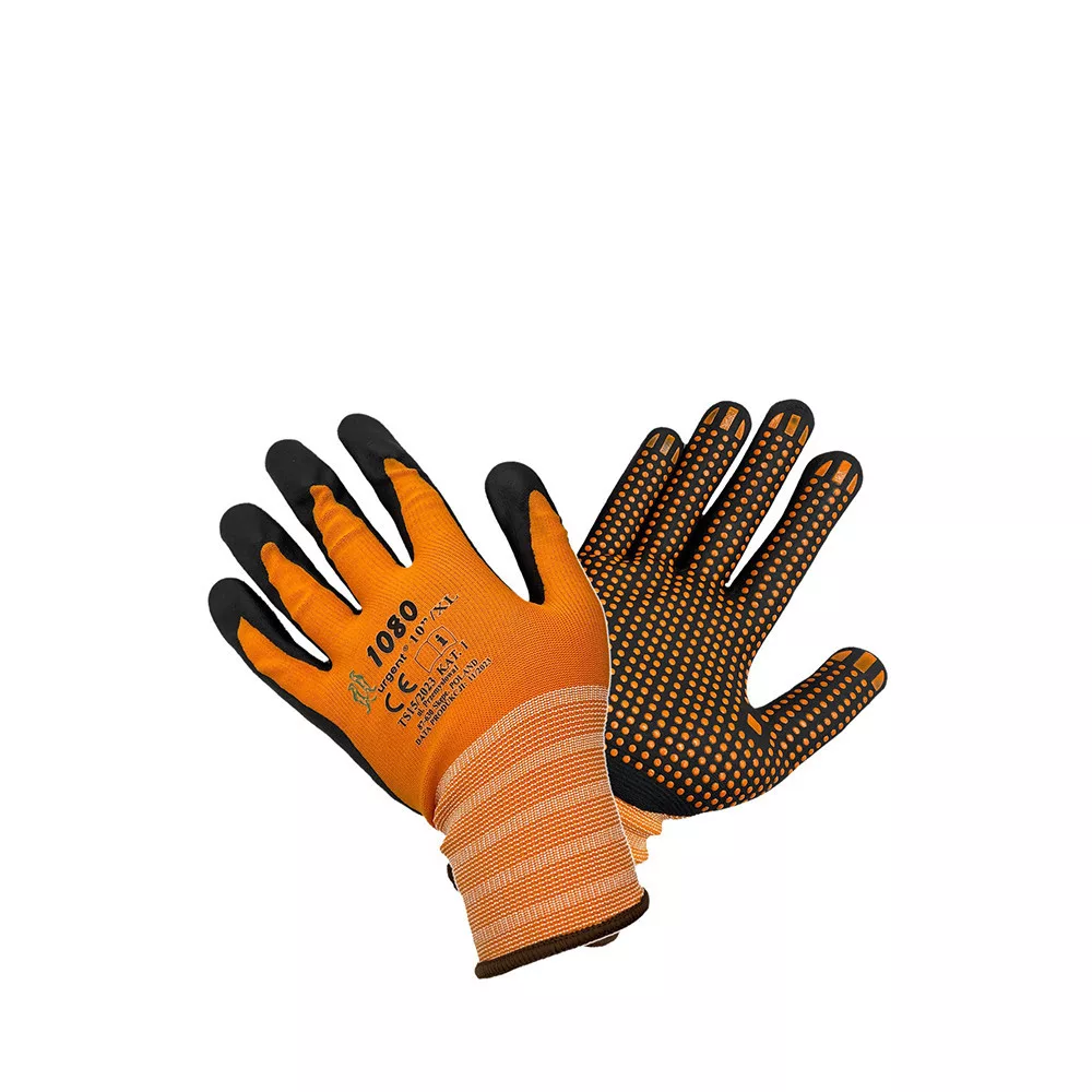 Nylon és spandex alapanyagú védőkesztyű, tenyerén ultravékony, rugalmas, habosított, homokos nitrilbe mártva, csúszásgátló nitril pöttyökkel és rugalmas mandzsettával.