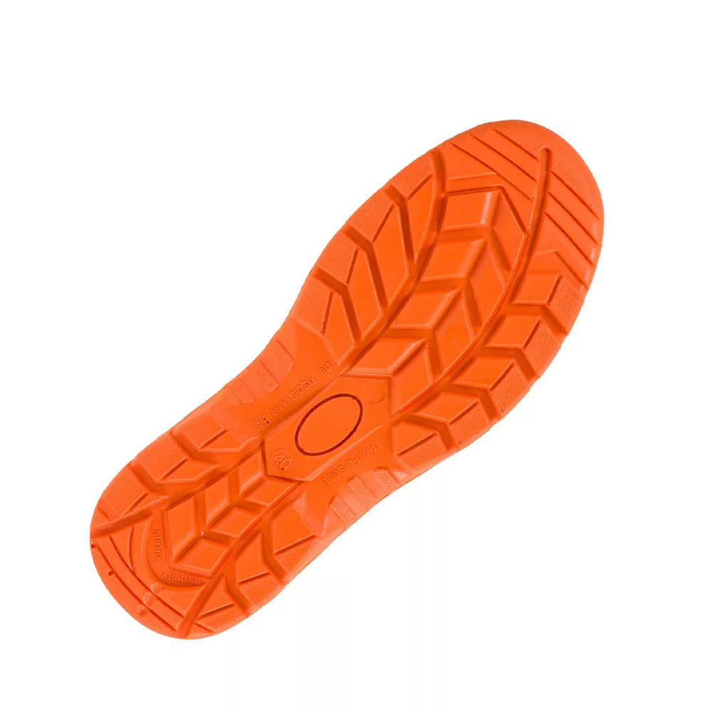 Talp:csúszásmentes, olajálló, antisztatikus, energiaelnyelő sarok, kétrétegű PU/PU, a külső talp keményebb, a belső puhább