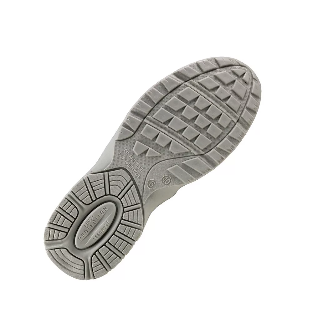 Talp:csúszásmentes, olajálló, antisztatikus, energiaelnyelő sarok, kétrétegű PU/PU, a külső talp keményebb, a belső puhább