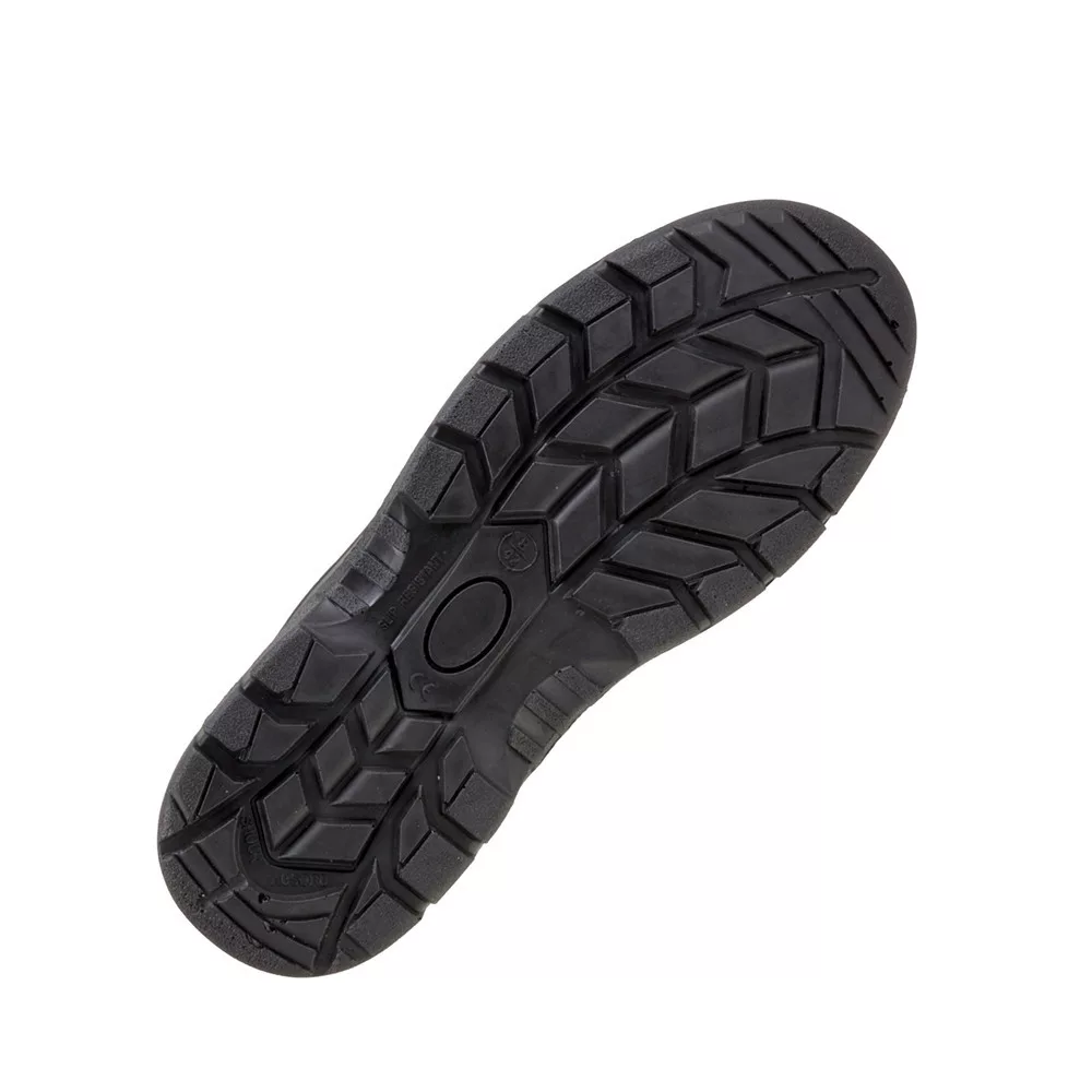Talp:csúszásmentes, olajálló, antisztatikus, energiaelnyelő sarok, kétrétegű PU/PU, a külső talp keményebb, a belső puhább