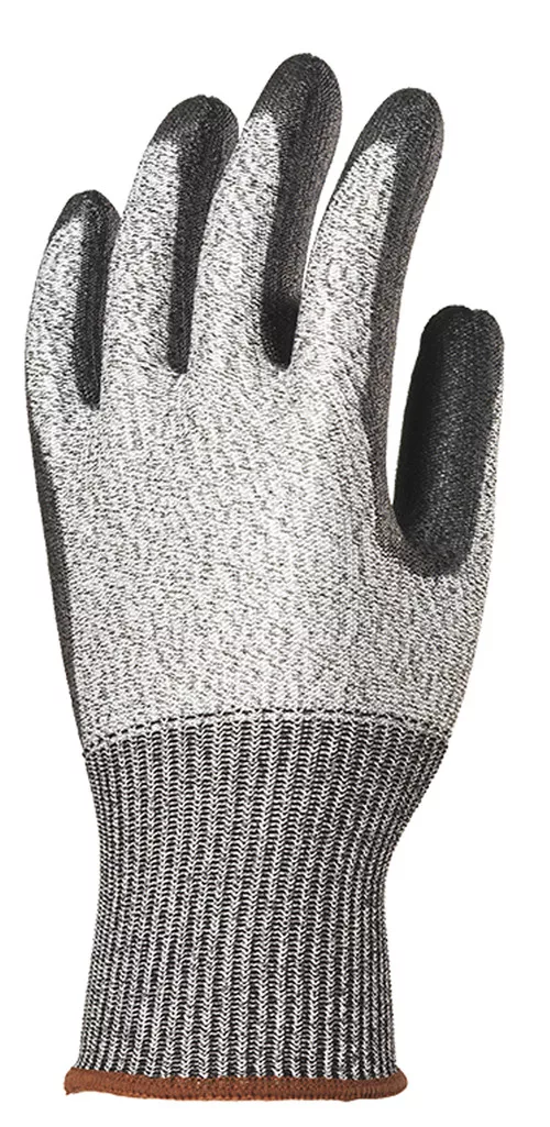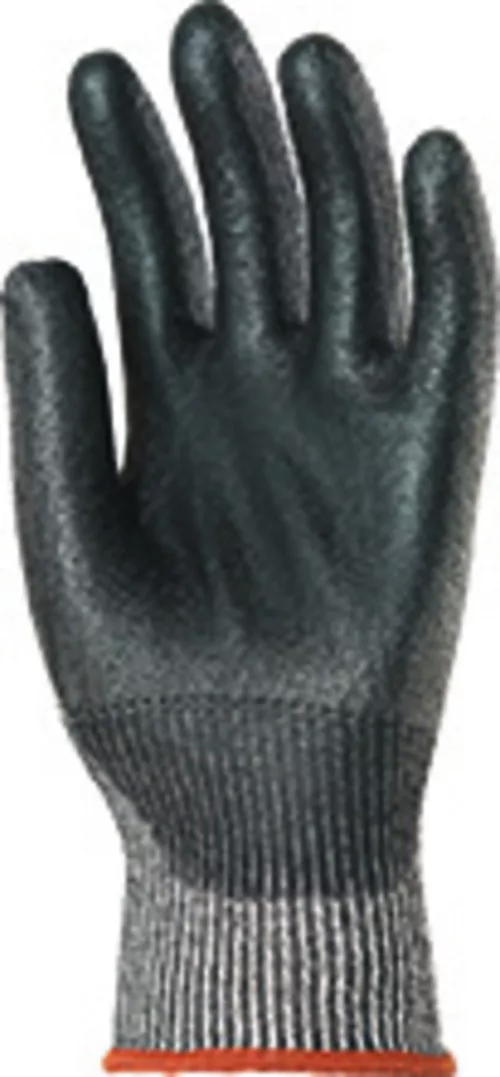 * erős szakítás- és kopásállóságú, 5-ös vágásbiztosságú, 13-as kötésű, * multiszálasüvegszál, szintetikus szálak és Spandex(R) védőkesztyű * tenyerén fekete, kopásálló PU mártás * szellőző kézhát, gumírozott mandzsetta