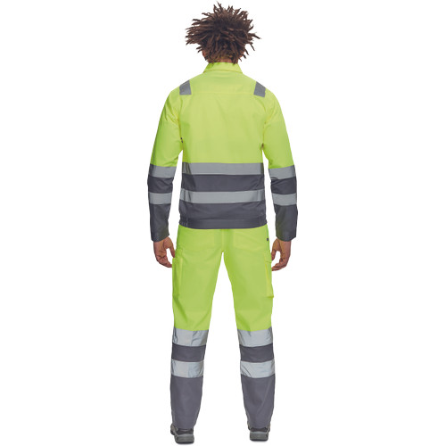 • férfi Hi-Vis kabát 5 cm széles fényvisszavető csíkokkal • tépőzáras hajtókával fedett cipzár • 2 nagy zsebfedős mellzseb • rugalmas oldalsó betétek az alsó szegélyen • tépőzáras mandzsetta