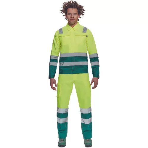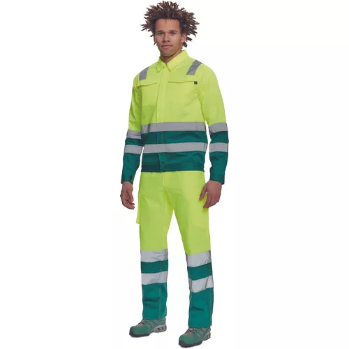 • férfi Hi-Vis kabát 5 cm széles fényvisszavető csíkokkal • tépőzáras hajtókával fedett cipzár • 2 nagy zsebfedős mellzseb • rugalmas oldalsó betétek az alsó szegélyen • tépőzáras mandzsetta