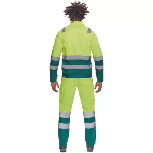 • férfi Hi-Vis kabát 5 cm széles fényvisszavető csíkokkal • tépőzáras hajtókával fedett cipzár • 2 nagy zsebfedős mellzseb • rugalmas oldalsó betétek az alsó szegélyen • tépőzáras mandzsetta