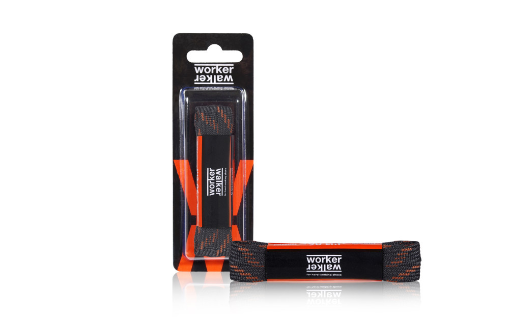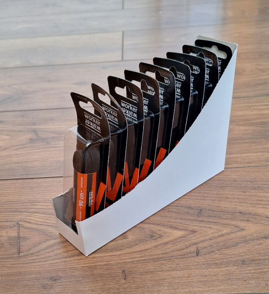 Lapított, poliészter cipőfűző. 10 pár / csomag, a csomagolás perforált, kínáló dobozzá alakítható.