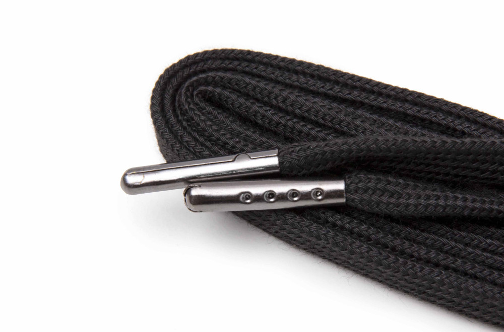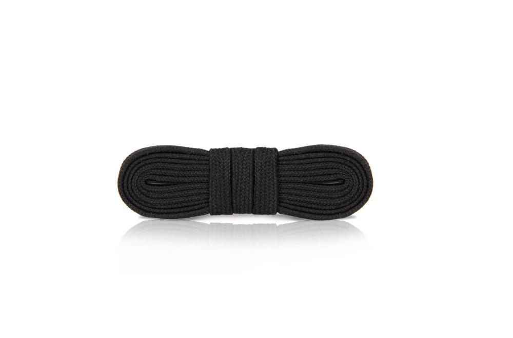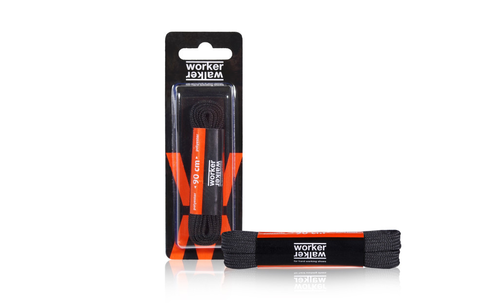 Lapított, poliészter cipőfűző. 10 pár / csomag, a csomagolás perforált, kínáló dobozzá alakítható.