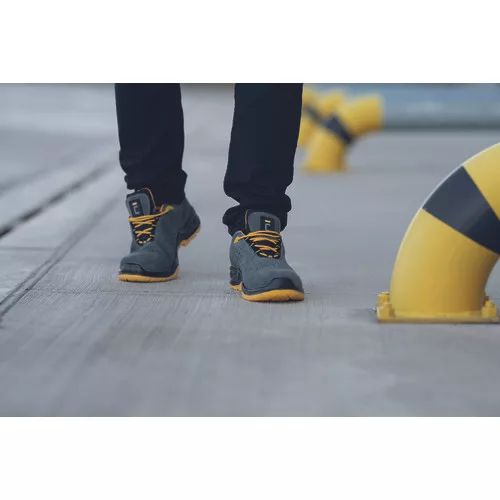 • biztonsági félcipő szürke-sárga színkombinációban • nubuk bőr felsőrésszel, amely teljes hosszában perforált • olajálló, csúszásgátló kettős sűrűségű PU talp • kényelmes, perforált belső talpbetéttel, energiaelnyelő sarokkal, kompozit lábujjvédővel és átszúrás ellen védő többrétegű textil köztappal készül • fémmentes kivitel • ESD védelem