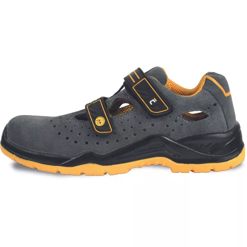 » biztonsági szandál szürke-sárga színkombinációban » teljes hosszában perforált nubuk bőr felsőrész » olajálló, csúszásgátló talp kettős sűrűségű poliuretánból » kényelmes, perforált belső talpbetéttel, energiaelnyelő sarokkal, kompozit lábujjvédővel, és kompozit köztappal » ESD védelem » nem tartalmaz fém alkatrészeket
