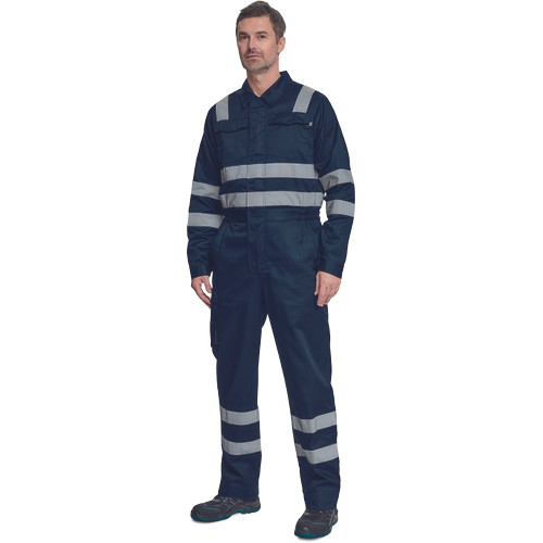 • férfi overall fényvisszavető csíkokkal • 5 cm széles csíkok a test körül • 7 cm széles csíkok a lábak körül • hajtókával fedett cipzár • 2 zseb az oldalán, 1 érmezseb • 1 multifunkciós oldalzseb a lábon • 2 hátsó zseb • 2 mellkasi zseb hajtókával • rugalmas betét a derék hátsó részén • meghosszabbítható szárhossz • 65% PES/35% pamut, 195 g/m2