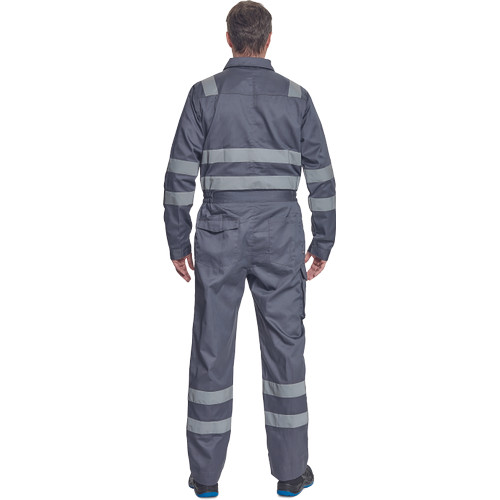 • férfi overall fényvisszavető csíkokkal • 5 cm széles csíkok a test körül • 7 cm széles csíkok a lábak körül • hajtókával fedett cipzár • 2 zseb az oldalán, 1 érmezseb • 1 multifunkciós oldalzseb a lábon • 2 hátsó zseb • 2 mellkasi zseb hajtókával • rugalmas betét a derék hátsó részén • meghosszabbítható szárhossz • 65% PES/35% pamut, 195 g/m2