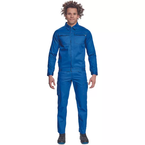 • férfi munkakabát • cipzáras, tépőzáras hajtókával • 2 nagy hajtókás mellkasi zseb • rugalmas oldalsó betétek a kabát alján • tépőzáras mandzsetta • 65% PES/35% pamut, 195 g/m2