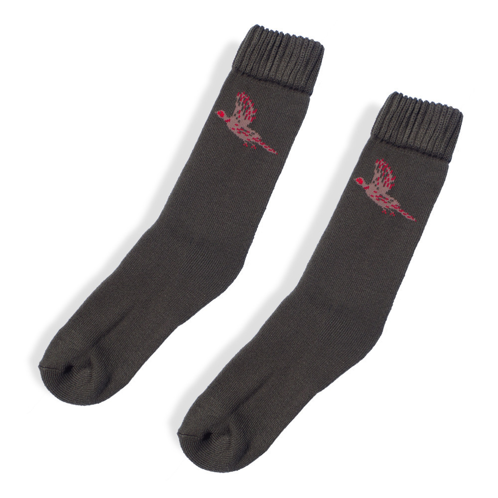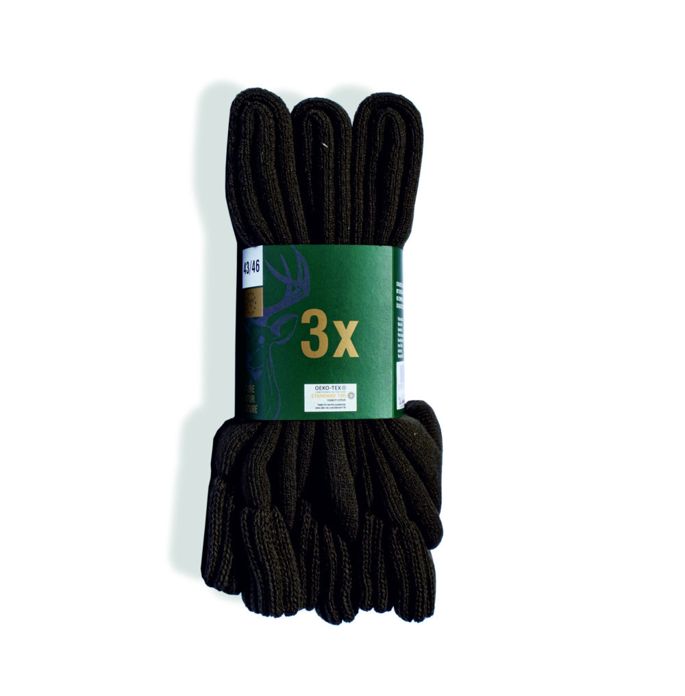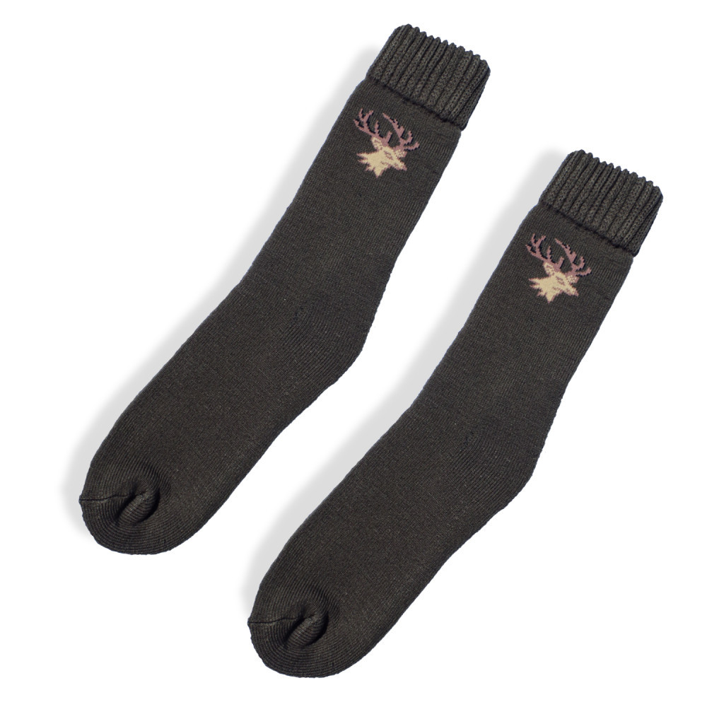 Csomagban lévő mennyiség: 3 pár - az egyik pár sima, a második szarvas motívummal, a harmadik kacsa motívummal a zokni mindkét oldalán. Sötétzöld-barna színű.