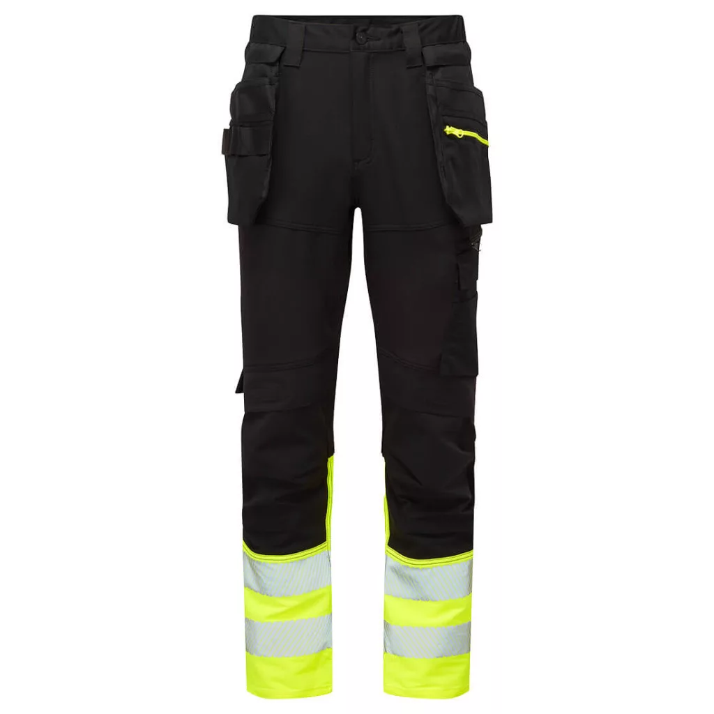 The DX4 Hi-Vis Class 1 Detachable Holster Pocket Craft Trousers uses the targeted placement of dynamic 4-way stretch fabrics to give maximum range of movement when working. The trouser features a high-rise back waistband with side elastication, ensuring protection in all working positions. Pre-bent top loading adjustable knee pad pockets, generously sized front pockets, detachable holster pocket and multi-functional zip thigh pockets offers secure storage. Triple stitching throughout for maximum durability.