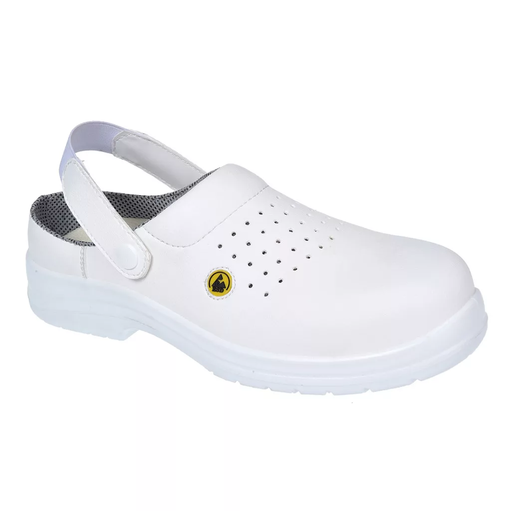 Lightweight safety clog with a perforated upper for added breathability. 100% non metallic with plastic stud fastener. Suitable for use in ESD environments. Complies with EN 61340-5-1.