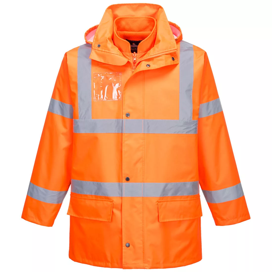 This superb 5-in-1 jacket system is adaptable for any work situation. Outer jacket features 2 large roomy pockets, stud adjustable cuffs and concealed attached roll-away hood. Inner jacket has fluorescent fleece sleeves, comfortable knitted cuffs and 2 side pockets. Both the inner and outer jacket have full EN ISO 20471 Class 3 certification for maximum high visibility protection and safety.