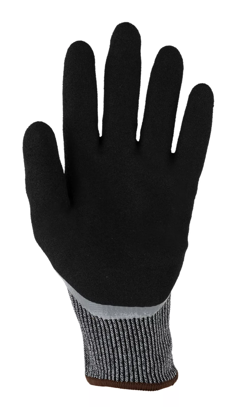Szürke, 13-as kötésű, varrás nélküli alapkesztyű HPPE, acélszál, spandex, poliészter összetételű alapanyagból.Kétrétegű nitril bevonat: 1 – ökölcsontig sima nitril mártás, 2 – tenyerén csúszásbiztos sandy réteg Kötött mandzsetta