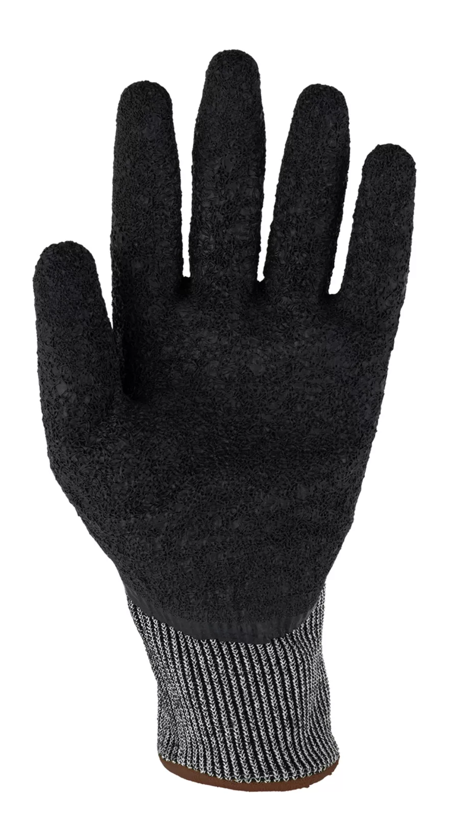 13-as kötésű szürke, varrás nélküli alapkesztyű HPPE-ből, acélszálból, spandexből és poliészterbőlFekete krepp latex bevonat ökölcsontigKötött mandzsetta