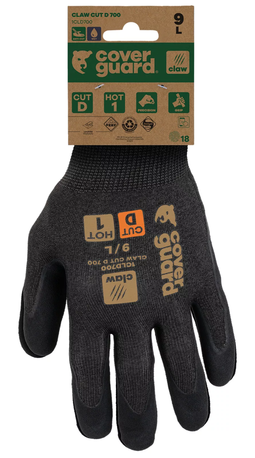 A CLAW CUT termékcsalád a vágásbiztos védőkesztyűk új generációját képviseli, melyet úgy terveztek, hogy a legkeményebb feladatok során is megvédjen a magas szinten nyújtott vágás elleni védelmmel (CUT D-től A9-ig). Kiváló kényelmet és kivételes fogásbiztosságot biztosít minden munkakörnyezetben (száraz, nedves és olajos).A CLAW CUT D 700 védőkesztyű precíziós munkákhoz készült, száraz és nedves környezetbe.A 18-as kötésű és a rendkívül puha, mégis erős alapkesztyű (HPPE, újrahasznosított poliészter és spandex anyagból) második bőr érzetet nyújt, miközben kiváló vágás elleni védelmet biztosít (CUT D).Tenyerén a csúszásbiztos sandy felületű dupla latexbevonat kiváló tapadást eredményez a legigényesebb munkákhoz mind nedves, mind száraz körülmények között. A CLAW CUT D 700 újrahasznosított poliészterből készül, és RCS tanúsítvánnyal rendelkezik (a termék összsúlyának 11%-a újrahasznosított alapanyagból áll).Érintőképernyő-kompatibilis, így nem kell levenned a kesztyűt digitális eszközök használata közben.Sanitized higiéniai kezelés: megelőzi a baktériumok és kellemetlen szagok kialakulását.