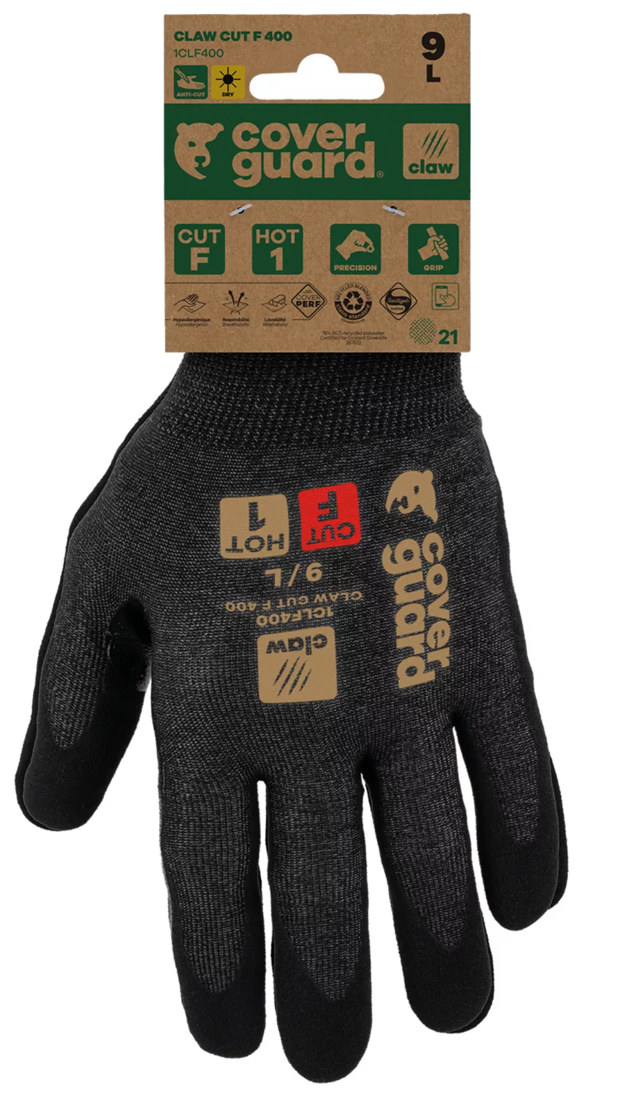 A CLAW CUT termékcsalád egy új generációs vágásálló kesztyű, amelyet arra terveztek, hogy megvédjen a legigényesebb munkák során, magas vágásállósággal (CUT D-től A9-ig), és kiváló komfortot, valamint kivételes ügyességet biztosítson minden munkakörnyezetben (száraz, nedves és olajos).A CLAW CUT F 400 modellt finom anyagmozgatási munkákhoz tervezték száraz és enyhén olajos környezetben. A magas 21-es kötés párosítva egy rendkívül puha és erős üvegszál, poliészter, acél és spandex alapú szálból készült, második bőr érzést nyújt, miközben maximális vágásvédelmet biztosít (CUT F, az EN388 szabvány szerint).A sandy nitril bevonat és a hosszú megerősítés a hüvelykujj és a mutatóujj között kiváló tapadást és jó fogást biztosít. Ez a bevonat nagyon jó légáteresztőséget garantál (COVERPERF címke alatt tesztelve).A CLAW CUT F 400 újrahasznosított poliészter szálból készült, és RCS tanúsítvánnyal rendelkezik (a termék összsúlyának 18%-a). Üvegszál nélkül.Ez a kesztyű érintőképernyős, így viselése közben is használhatja a képernyős eszközöket. Sanitized kezelés: megakadályozza a baktériumok és szagok fejlődését, és a CLAW CUT F 400 hypoallergén is (COVERPERF SKINCARE teszt).