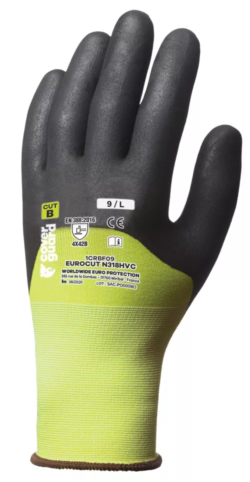 * 18-as kötésű, vágásbiztos fluo sárga HPPE + nylon + elasztán védőkesztyű * ökölcsontig fekete szellőző mikrohabosított nitrillel mártva* Ergonomikus forma,Kötött mandzsetta