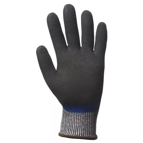 Pettyezett, szürke,13-mas kötésű varrásnélküli kesztyű. HPPE-vel, ásványi szálakkal, poliamiddal és elasztánnal erősítve.Duplán mártott nitril tenyér: egy réteg sima kék, egy érdesített fekete.Ergonómikus kialakítás.Kötött mandzsetta