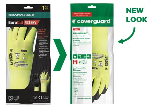 18-as kötésű, varrás nélküli, fluo sárga színű, vágásbiztos HPPE + nylon + elasztán védőkesztyű, Tenyerén fekete szellőző mikrohabosított nitril mártásKötött mandzsetta