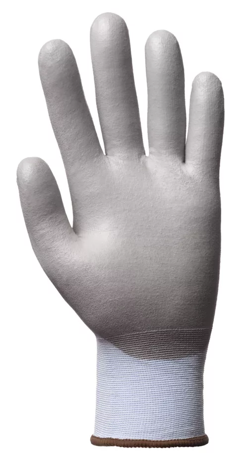 Világoskék HPPE-vel, poliamiddal és elasztánnal erősített, 18-as kötésű kesztyű.Szürke PU-val mártott tenyérKötött mandzsetta