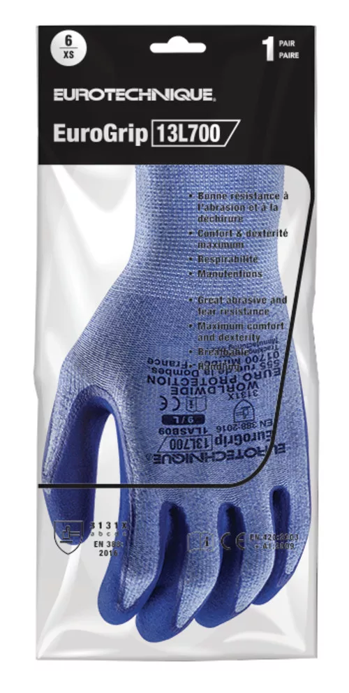 * 13-as kötésű kopásálló kék poliészter és elasztán alapkesztyű * tenyéren kék színű dupla latex mártás, csúszásbiztos szemcsés felülettel * nedves környezetben is extra csúszásbiztosság * kifejezetten kényelmes, teljesen kézre simuló formai kialakítás, kiváló fogásbiztosság OEKO-TEX® STANDARD 100 minősítéssel, CQ 1301/1, IFTH vagy 17.HCN.01391,