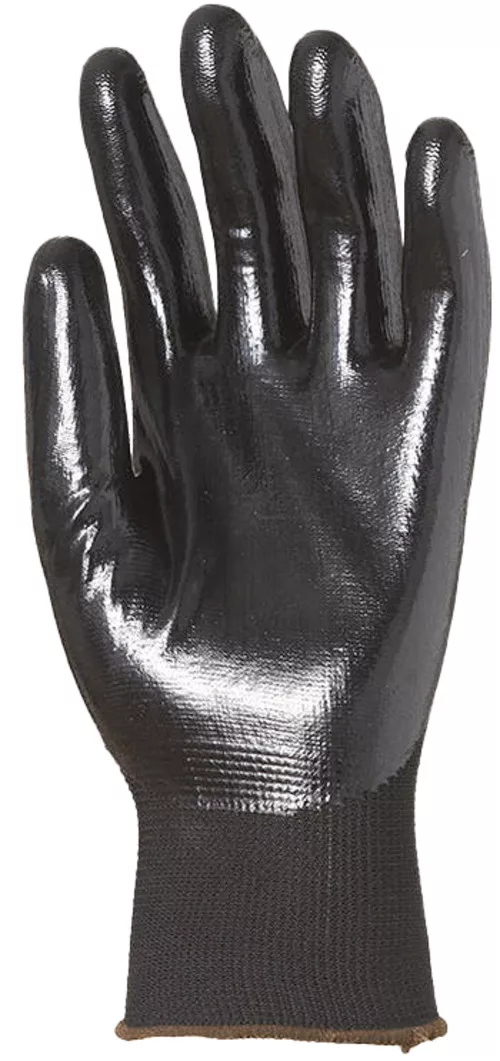 Fekete, varrás nélküli poliészterrel erősített kesztyű, ökölcsontig sima nitrillel mártva, kötött mandzsettával.