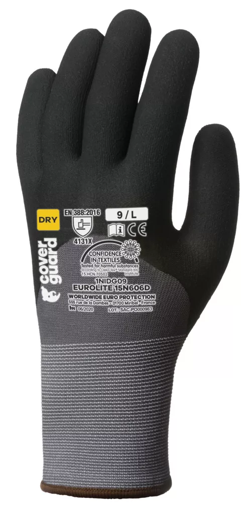Szürke, varrás nélküli, poliamiddal megerősített, 15-ös kötésű kesztyű. A tenyérrészen nitil mikrohab pettyekkel és kötött mandzsettával * OEKO-TEX® STANDARD 100 minősítés, CQ 1301/1, IFTH vagy 15.HCN.70502, HOHENSTEIN