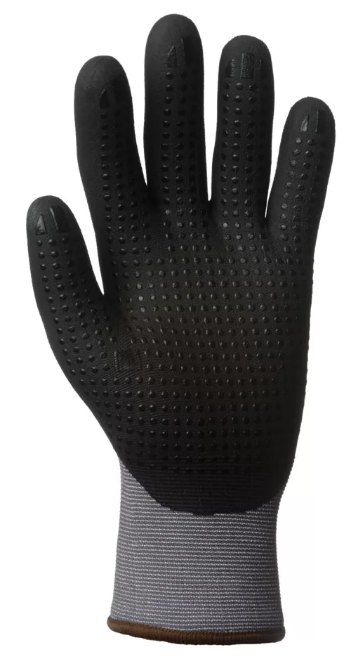 Szürke, varrás nélküli, poliamiddal megerősített, 15-ös kötésű kesztyű. A tenyérrészen nitil mikrohab pettyekkel és kötött mandzsettával * OEKO-TEX® STANDARD 100 minősítés, CQ 1301/1, IFTH vagy 15.HCN.70502, HOHENSTEIN