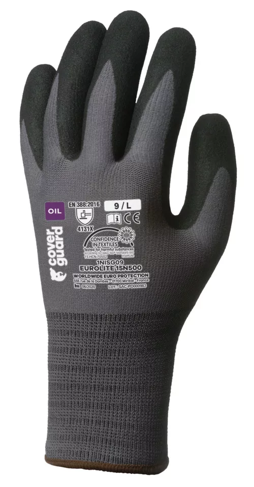 Szürke, varrás nélküli, poliamiddal megerősített, 15-ös kötésű kesztyű, kötött mandzsettával.Duplán, nitrillel mártott tenyér: egy réteg sima, egy réteg érdesített.OEKO-TEX® STANDARD 100 minősítés , CQ 1301/1, IFTH vagy 15.HCN.70502, HOHENSTEIN