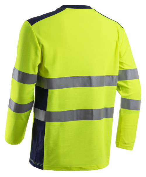 Rikka hosszú ujjú póló hi-víz sárga és sötétkék színben* Bird-eye kötés: 55% pamut / 45% poliészter – 150g/ m2* 5 cm széles fényvisszaverő csíkok – varrott és mikrogyöngyös technológia - 2 – 2 a testen és a karokon * A pamut réteg érintkezik a börrel* Környakas kialakítás, hosszú ujjú fazon * Kontraszt színű betétekkel a galléron, a vállon, és az oldalrészen * UV elleni védelem – UPF35+* 60 mosás