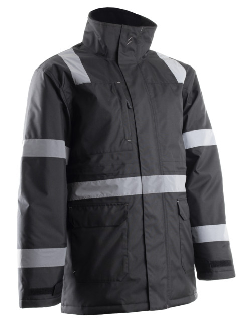 Securite fekete télikabát fényvisszaverő csíkokkal* Oxford: PU-val mártott 100% 300D Oxford PES + 160 g/m2 vastag melegbélés + fényvisszaverő csíkok* Hegesztett varrás* Állítható derék és mandzsetta* Szélálló mandzsetta* Polár béléses gallér* Dupla hajtókával fedett cipzár* Gallérba rejtett kapucni* Előformázott könyökrész* 8 zseb* Varrott fényvisszaverő csíkok* Szitázható