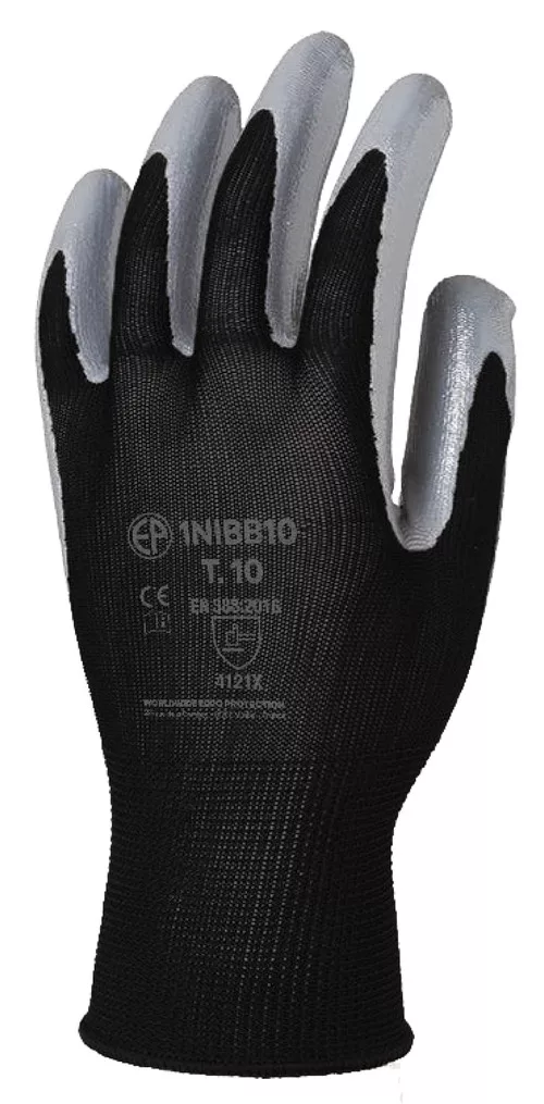 * fekete, kiválóan kézre illeszkedő, 13-as kötésű, poliészter alapkesztyű * tenyerén szürke kopásálló nitrillel mártott * gumírozott, rugalmas mandzsetta, szellőző kézhát